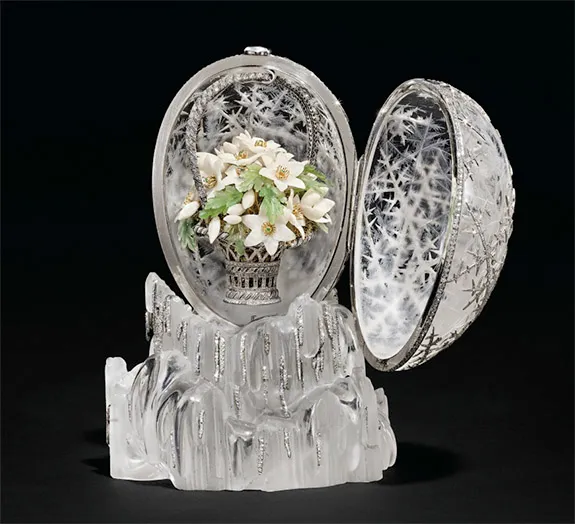 Carved from rock crystal as thin and clear as glass, the egg is overlaid with 4,500 rose-cut diamonds set in platinum. It rests on a sculpted rock-crystal base that resembles a melting block of ice, its surface streaked with diamond-set rivulets that suggest spring’s first thaw. Inside lies the signature Fabergé “surprise”: a delicate basket of white quartz anemones, complete with demantoid garnet pistils and nephrite leaves.