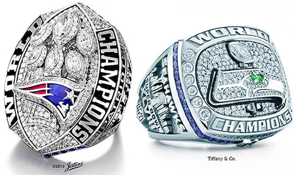 Credits: Patriots' ring photos courtesy of Jostens. Seahawks' ring photo courtesy of Tiffany & Co.