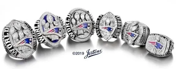 By the time the Patriots claimed their sixth title in Super Bowl LIII, the jewelry had reached then-record-setting proportions. That Jostens-designed ring featured 422 diamonds totaling 8.25 carats, along with 20 blue sapphires weighing 1.60 carats. It was billed as the largest Super Bowl ring ever created — essentially a wearable monument to dynasty-level success.