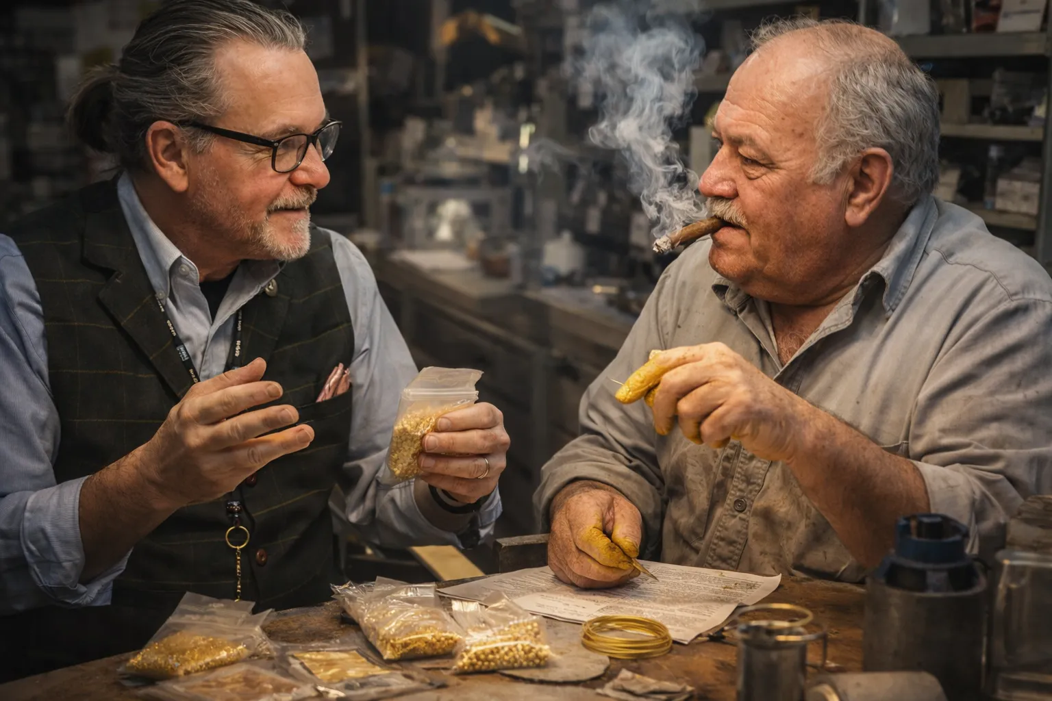 When I worked in my dad’s shop, there was a refiner named Vic Galatian who would come by every month. He supplied sizing stock, gold wire, casting grain—whatever we needed. When we had scrap to refine, Vic handled that too. He was a character. Always smoking a cigar. Fingers yellow from working with acids. But he knew his business.