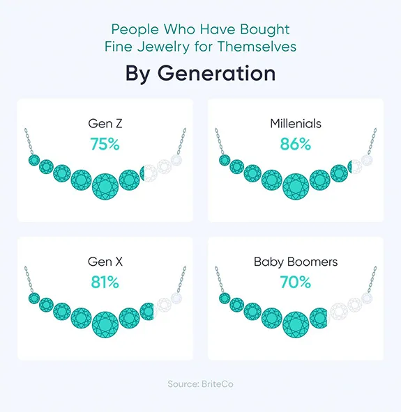 The survey, which polled 1,002 adults across the country, highlights a strong embrace of “treat yourself” culture, especially among Millennials aged 30–44, who are the most active self-purchasers. In this age group, a remarkable 86% say they have purchased fine jewelry for themselves, leading all generations. For these buyers — many in their prime earning years — jewelry is both a personal reward and a meaningful way to mark life’s achievements.