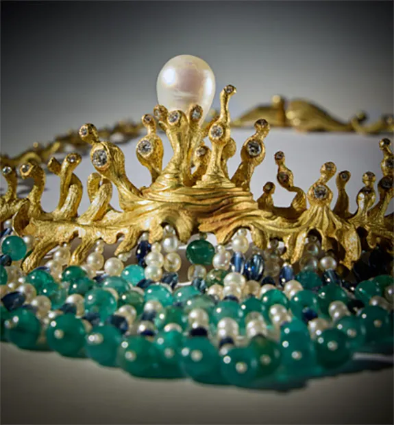 Described as sculptural and sensuous, the Swirling Sea Necklace evokes the hypnotic rhythm of waves breaking on a golden shore. Flowing tassels of gold are interspersed with sapphire and emerald beads, pearls and diamonds — a composition that mimics the motion and shimmer of the sea itself. The piece culminates in a luminous baroque cultured pearl, nestled just below the wearer's Adam's apple like a cresting wave.