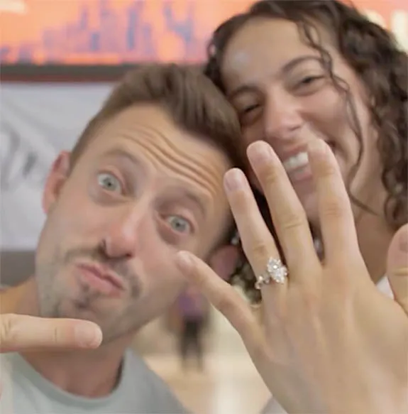 The engagement ring appears to feature a marquise-cut diamond flanked by matching marquise side stones on a yellow gold band — an elegant and timeless choice befitting a cinematic love story.