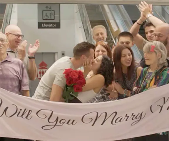 When it came time to propose, Brenner knew there was only one place it could happen. He returned with Venella to Terminal E, this time not just with butterflies — but with a plan. He even arranged for a custom banner to cover the original sign, reading, “Will you marry me?”