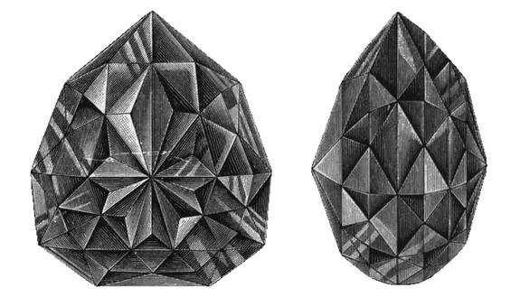Credits: Photo of the reproduction of the Florentine Diamond by Manuelarosi, CC BY-SA 4.0, via Wikimedia Commons. Historical technical drawing by Ahnode, Public domain, via Wikimedia Commons.