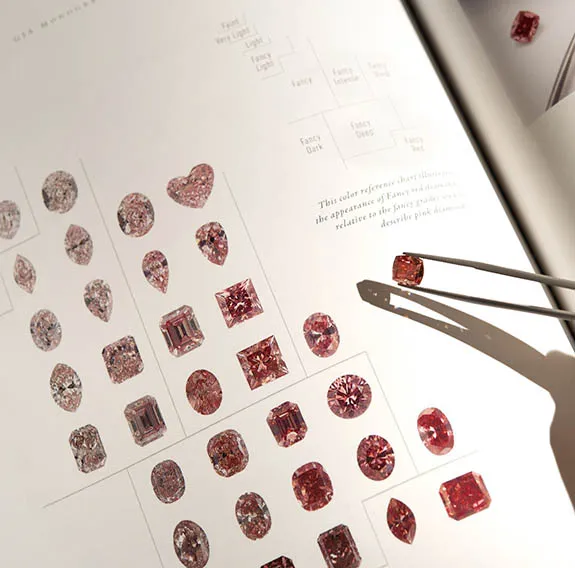 Stones are first sorted by hue — purplish pink (PP), pink (P), pink rose (PR) and pink champagne (PC) — and then assigned an intensity rating from 1 (deepest) to 9 (lightest). A 1P diamond therefore represents a pure pink stone with the highest possible saturation, making it extraordinarily rare.