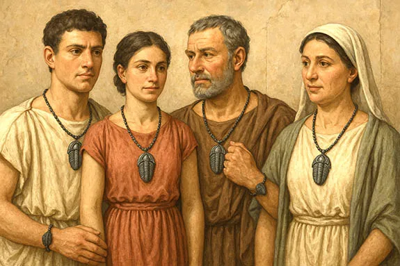 Credits: Jewelry illustration courtesy of A. Fernández-Fernández et al., Archaeol Anthropol Sci (2025). AI-generated image of ancient Romans wearing trilobite jewelry by The Jeweler Blog using ChatGPT and DALL-E 3. Trilobite illustration by Віщун, CC BY-SA 4.0, via Wikimedia Commons.