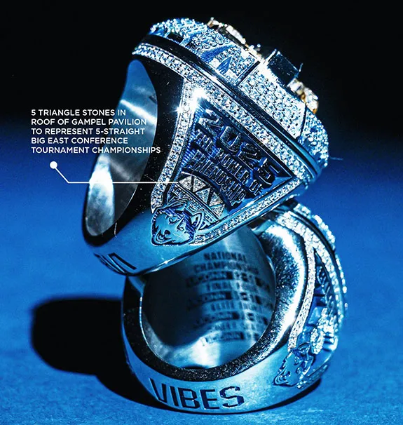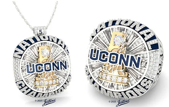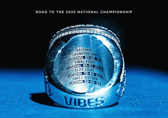 This imaginative design came to life through collaboration between Jostens and three UConn stars: Paige Bueckers, Azzi Fudd and Caroline Ducharme. The players helped shape the aesthetics and symbolism, favoring a mostly silver finish accented by the gleaming gold trophy at center — a nod to their shared values of unity, friendship and relentless pursuit of excellence.