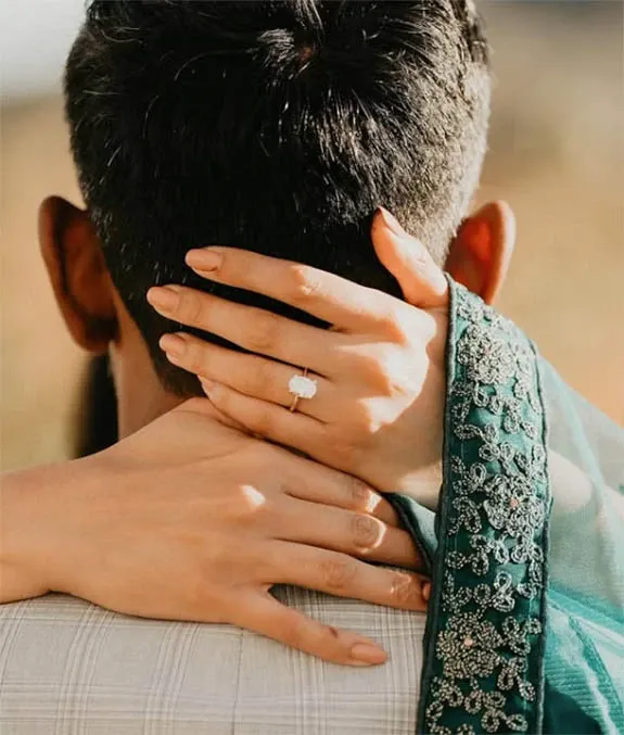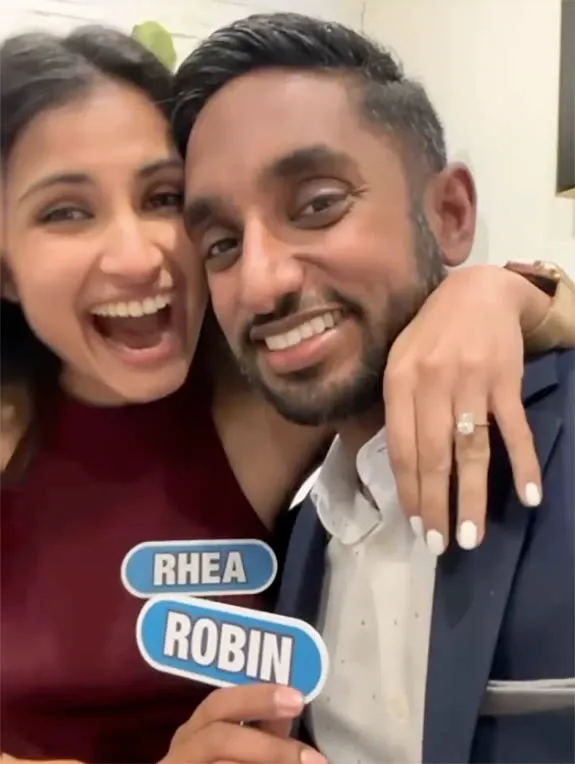 Kuriakose pulled an oval-cut diamond ring from a ring box, went down on one knee and proposed with the phrase, "Rhea Susan Mathew, will you marry me?"