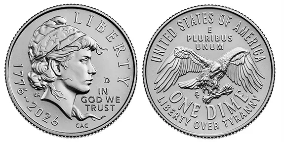 Beyond the quarters, the dime is getting one of the most dramatic redesigns in its history. Replacing the long-standing Roosevelt portrait is an “Emerging Liberty” design showing a windswept Liberty wearing a stars-and-stripes liberty cap. The reverse features an eagle in flight carrying arrows and the inscription “Liberty Over Tyranny.”