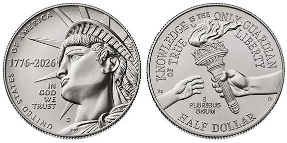 Collectors will also have two special options not intended for everyday circulation. The Enduring Liberty Half Dollar features a close-up of the Statue of Liberty on the obverse, while the reverse depicts Liberty passing her torch to the next generation — symbolizing continuity and the transmission of American ideals.