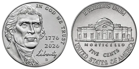 The nickel keeps its familiar Thomas Jefferson portrait and Monticello reverse, but adds the commemorative 1776 ~ 2026 dual date — a subtle but meaningful nod to the Semiquincentennial.