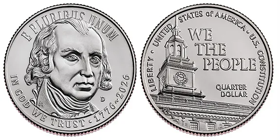 The US Constitution Quarter features James Madison, known as the “Father of the Constitution.” The reverse highlights Independence Hall and the inscription “We the People,” emphasizing government by the consent of the governed.