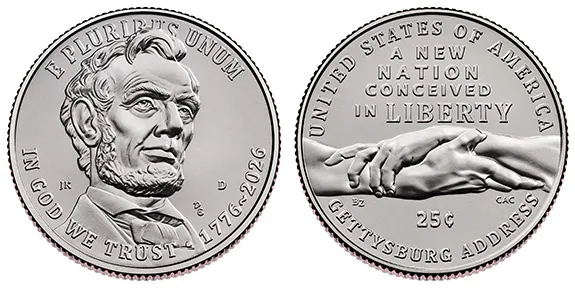 Rounding out the series is the Gettysburg Address Quarter, with Abraham Lincoln’s portrait on the obverse. The reverse shows two clasped hands alongside the phrase “A New Nation Conceived in Liberty,” reflecting unity and national resolve.