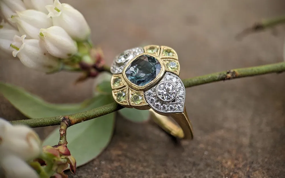 Cindy came to us with a very special project. Her desire was to create a vintage inspired design with her birthstone, an Alexandrite Gemstone.